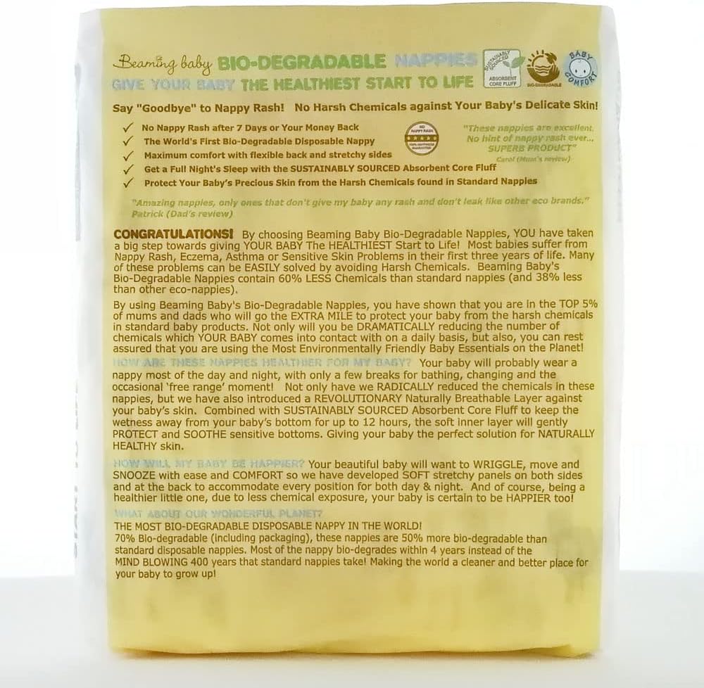 CONGRATULATIONS!By buying Beaming Baby Bio-Degradable Nappies, YOU have taken a big step towards giving YOUR BABY the HEALTHIEST start to life! Most babies suffer from Nappy Rash, Eczema, or Sensitive Skin Problems in their first three years of life. Many of these problems can be easily solved by avoiding harsh chemicals. By using Beaming Baby's Nappies you have shown that you are in the TOP 5% of Mums and Dads who will go the EXTRA MILE to protect your baby from the nasty chemicals found in standard baby products. Not only will you be DRAMATICALLY reducing the number of chemicals which YOUR BABY comes into contact with on a daily basis, but also, you can rest assured that you are using the most environmentally friendly baby essentials on the planet! Your baby will probably wear a nappy most of the day and night, with only a few breaks for bathing, changing and the occasional 'free range' moment! Not only are our Beaming Baby nappies FREE from Harsh Chemicals, but we have also introduced a REVOLUTIONARY Naturally Breathable Layer against your baby's skin. Combined with a TOTALLY GM FREE Absorbent Core to keep the wetness away from your baby's bottom for up to 12 hours. They are HEALTHIEST for your baby. Each nappy is completely FREE from Harsh Chemicals that are often found in standard disposable nappies. Our Nappies are kind to all babies, especially those with eczema or sensitive skin. They form a naturally breathable layer against your baby's skin; the top sheet is made with natural cotton and cornstarch fibres (bio degradable). The absorbent layer inside the nappy is made primarily from "fluff", this is very finely shredded paper, which has the consistency of cotton wool. Totally chlorine free and contain only clean plastics which are used in the Velcro patch and elasticated back and side panels.Our Nappies are 40% more bio-degradable than standard nappies and contain 30% less chemicals, the most bio-degradable nappies in the world!