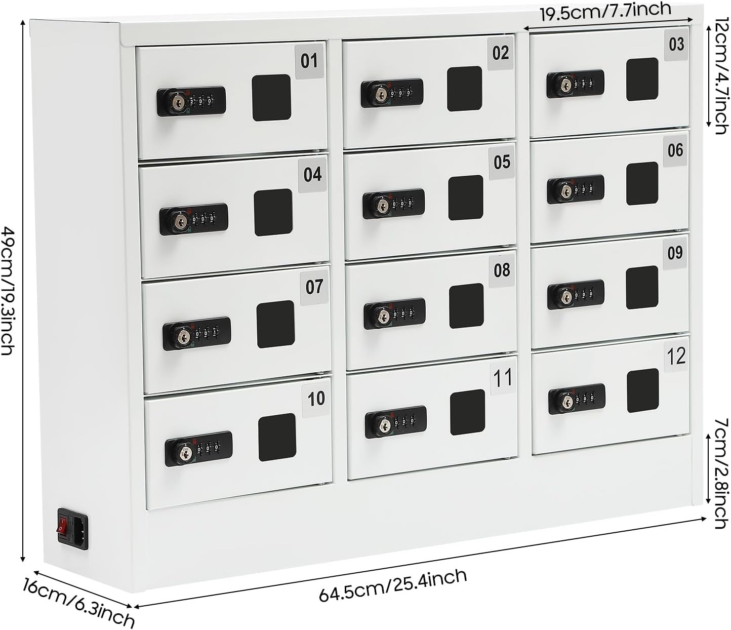 ★DescriptionWhat a great feeling of security when a cell phone that needs to be kept in a secure place can be powered! This cellphone locker can do this very well.The cellphone locker is made of strong and durable cold-rolled steel, making it hard to rust.12 compartments and a 3-in-1 charging cable not only provide you with enough storage space but also can charge your cell phone.It is a good helper for your study and work.★DetailsImpact Pads: Impact pads on the back protect the walls and back of the product from wear and tear.Plug-in Power Cord: Plug-in power cord can reduce electrical resistance, so it can provide you with higher safety and can effectively extend the life of the product.Three-in-one Charging Ports: Three charging ports in every cabinet can be adapted to most cell phones, providing more convenience for your charging.★How to Open LockTo reenter your 3 digital pins.Turn lock.Open the door and remove your phone.★How to Set Up New PasswordYou can set up any password in the open situation, eg: 168 ).After setting up your own password, rotate the knob 180° CCW(Counter Clockwise), and clutter the password).★How to Find Out Your Forgotten PasswordIf you forgot the password, you can find out it by key.Insert the key into the plug.Rotate the key 180° CW (Clock Wise).Slide the rolling wheel one by one, till the wheel can not move, that’s the password you forget.Rotate the key 180° CCW (Counter Clock Wise), and take out the key.★ApplicationThis cellphone locker can be used to store important items and charge mobile phones and can be widely used in schools, churches, airports, hotels, gyms, health clubs, government buildings, camps, apartment buildings, hospitals, military, supermarkets, shopping centers, bathrooms, employee cabinets, leisure places, and other places.★SpecificationMaterial: Cold Rolled Steel, AcrylicSurface Treatment: Electrostatic Powder CoatingColor: WhiteStyle: ModernPlug Type: American StandardInput: AC 110VOutput: DC 5~9VShape: RectangularNumber of Cabinets: 12Lock Type: CombinationSize of Single Cabinet: 19.5*16*12cm / 7.7*6.3*4.7inBase Height: 7cm / 2.8inGross Weight: 14.55kg/ 32.08 lbs Net Weight:13.5 kg/ 29.76 lbsProduct Size: 64.5*16*49 cm/ 25.4*6.3*19.3 inPackage Size: 68*52*18.5 cm/ 26.77*20.47*7.28 in★Package Included1 * Cellphone Locker1 * Power Cord1 * Chinese and English Manual3 * KeysAll Accessories for Installation★NotesPlease note that the original password is “000”.Please do not use the phone when it is being charged.Products with electrical plugs are designed for use in the US. Please check compatibility before purchasing.Please read the operating manual completely before use. And pay particular attention to the safety instructions included.