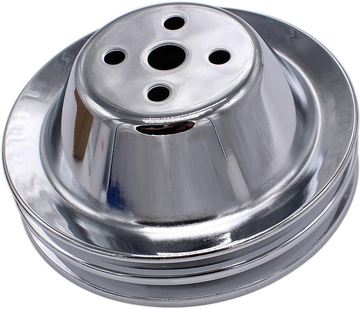 Direct Replacement.Look for compatibility list for fitment or just ask us.Machined From Billet SteelChrome Short Pump Crank Pulley - Double Groove 7-3/8" Diameter.Chrome Short Water Pump Pulley - Double Groove Diameter is 6-3/8"Note: Water Pump Pulley: Mounted length is from the face of the water pump pulley mount towards the front of the engine. Crank Pulley: Mounted length is from the face of the harmonic balancer towards the front of the vehicle.Fit:Compatible with Small Block Chevy Motors With a SHORT water pumpCompatible with GM Motors With a SHORT water pumpCompatible with SBC 283-350 V8 enginesPackage Include:1 x Double Groove Short Water pump pulley1 x Double Groove Short Pump Crank pulley