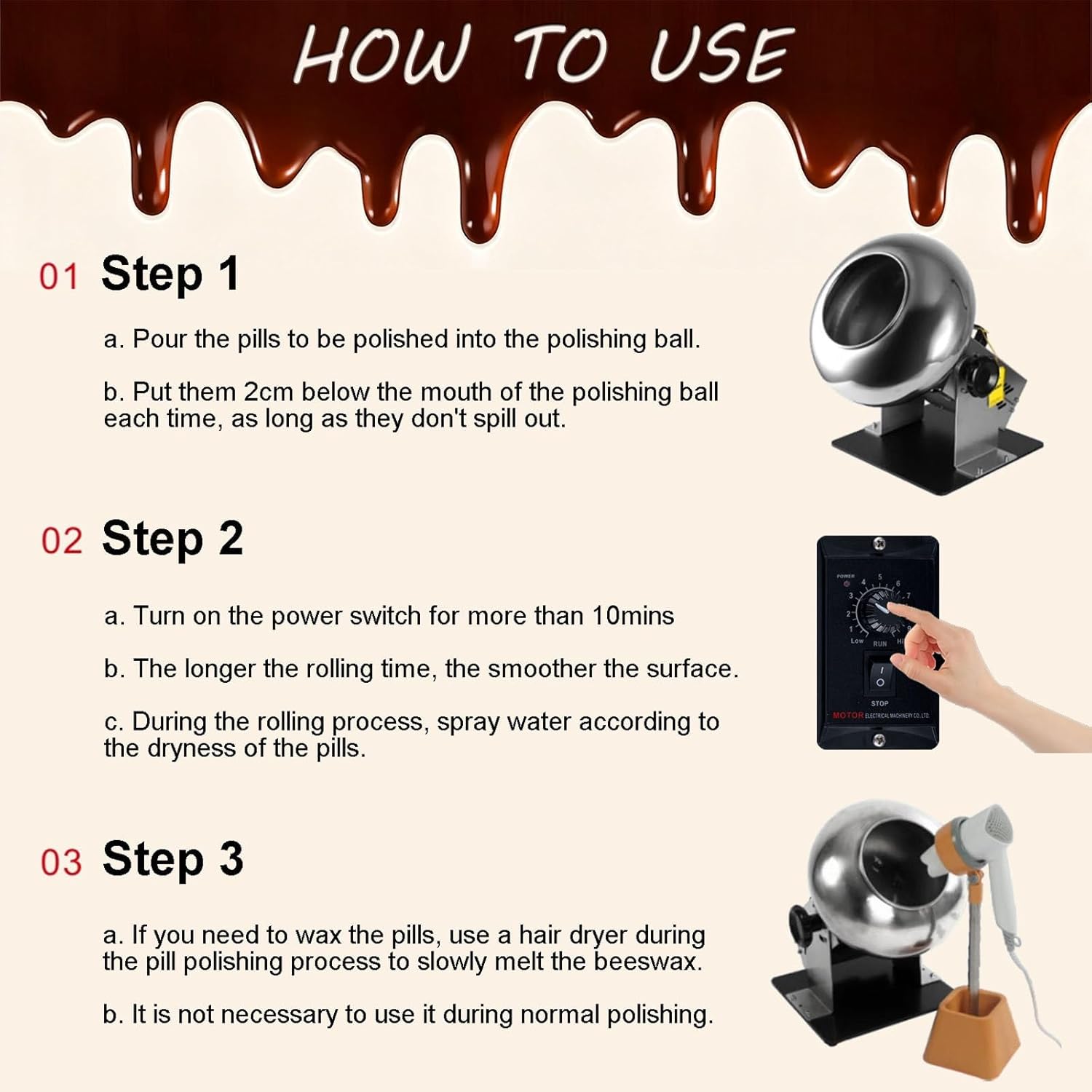 ✨ Elevate Your Confectionery Creations with Our Professional Sugar & Chocolate Coating Machine! ✨Whether you're crafting exquisite chocolate-covered treats, pill coatings, or seasoning snacks—this multifunctional machine is your ultimate partner for optimal results and efficient production.——— ❤️ KEY FEATURES ❤️ ———✅ Adjustable Tilt Angle – Customize the working angle for more comfortable use.✅ Adjustable Speed – upgraded steepless speed knob 0-72rpm.✅ Thickened 304 Stainless Steel Pot – Offers superior durability and meets food-grade safety standards.✅ Optimized Heat Dissipation – Large vents avoid overheating, even during prolonged use.✅ High Batch Capacity – Handles 1–3 kg per load, suitable for home and small commercial production.✅ One-Button Power Switch – Intuitive and easy to use, with convenient control.——— ❤️ SUITABLE FOR ❤️ ———✔️ Chocolate Shops & Candy Makers✔️ Home Bakers & Hobbyists:✔️ Commercial Kitchens & Bakeries✔️ Health Product Producers✔️ Culinary Schools & Workshops——— ❤️ HOW TO USE ❤️ ———① Pour materials (pills, candies, etc.) into the polishing drum, filling up to 2cm below the rim.② Turn on the machine and let it run for at least 10 mins. The longer it runs, the smoother the coating.③ Adjust the spraying amount (water or syrup) according to the candy state. For wax coating, use a hair dryer to melt beeswax while rolling.——— ❤️ TECHNICAL SPECIFICATIONS ❤️ ——— Product Name: Sugar Coating Machine Material: 304 Stainless Steel Motor Type: Pure Copper Motor Motor Power: 200W Pot Diameter: 32cm Rotation Speed: 0-72 r/min Capacity Per Batch: 1–3 kg Machine Dimensions: 40×30×42cm Net Weight: 13.5kg——— ❤️ PACKAGE INCLUDES ❤️ ———1 × Chocolate Coating Machine1 × Stand1 × Blower1 × User Manual