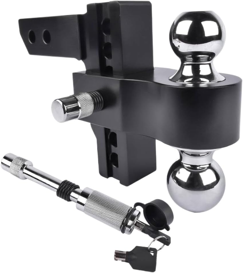 Product Type: Trailer Hitch Color: Black Fits: 2-Inch Receiver Features: Trailer hitches are constructed from aluminum, a lightweight and material.The polished aluminum frame resists rust, cracking, and flaking.The integrated ball head eliminates the need for separate ball mounts and prevents detachment during use.It also reduces vibrations, chucking noise, and rattling when towing.The hitch includes both a 2-inch and a 2-5/16-inch ball, along with two locking hitch pins and to secure the ball mount platform and provide anti-theft protection.This tow hitch is suitable for towing boats, trailers, campers, livestock trailers, recreational vehicles, bikes, ATVs, and motorcycles.The locking pin comes with a plastic cover that shields the lock cylinder from rain, water, sand, and other elements, designed for long-term.Model: AP03 Capacity: 12, 500 LBS GTW Adjustability: 6-Inch Drop/Rise Receiver Size: 2-inch How to Adjust: Slide the ball joint onto the stem, insert the pin through the desired slot, and secure it in place.