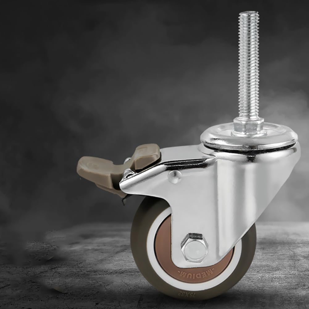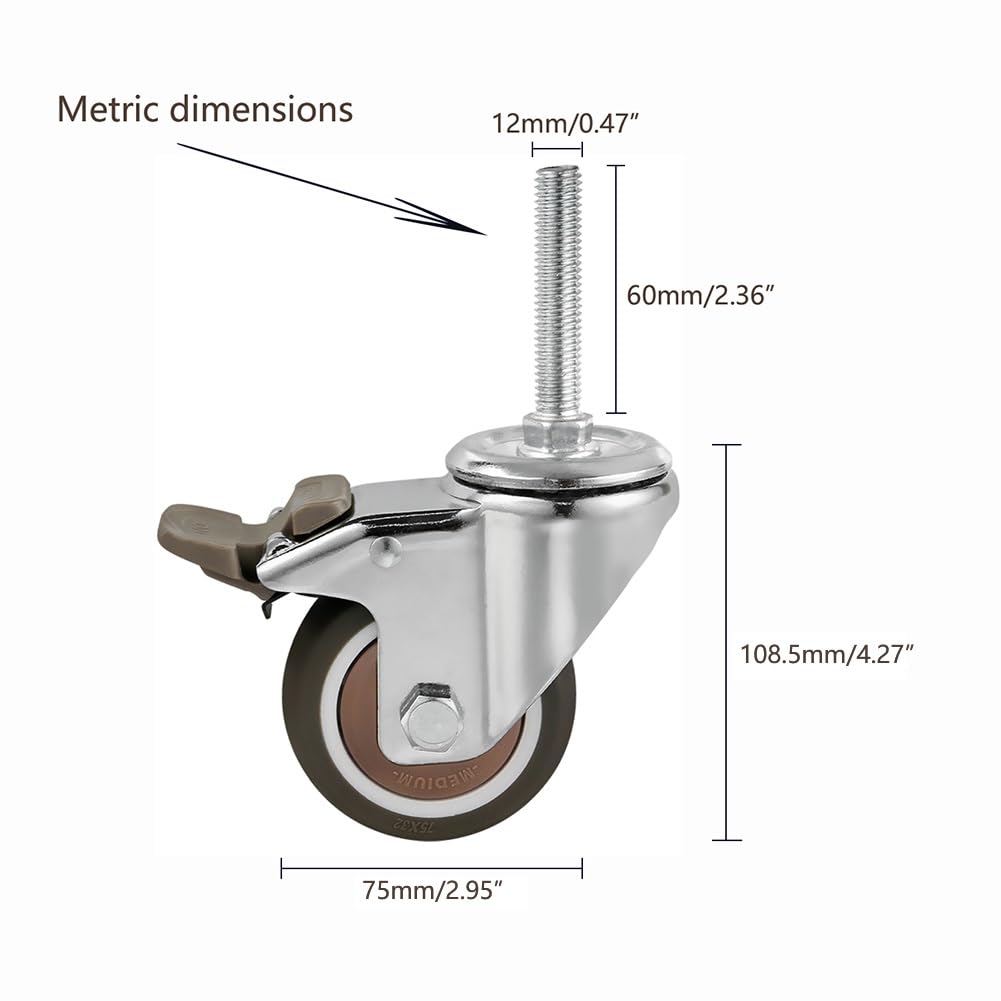 This threaded stem swivel caster can help you move heavy objects easily and maintain a quiet atmosphere. The excellent material means you don't have to worry about damaging the floor.Product specifications:▣Package contents: 4 * casters (with brakes)▣Name: Threaded Stem Caster▣Material: TPE soft rubber + carbon steel▣Castor diameter: 75mm / 2.95"▣Wheel width: 32mm / 1.26"▣Installation height: 108.5mm / 4.27"▣Threaded rod size: M12*60mm / 0.47"*2.36"▣Single wheel load-bearing: 85kg /187lb▣Four-wheel load-bearing: 255kg / 562lbPlease note that this is a metric size threaded rod caster, please measure the required size carefully before purchasing, thank you!