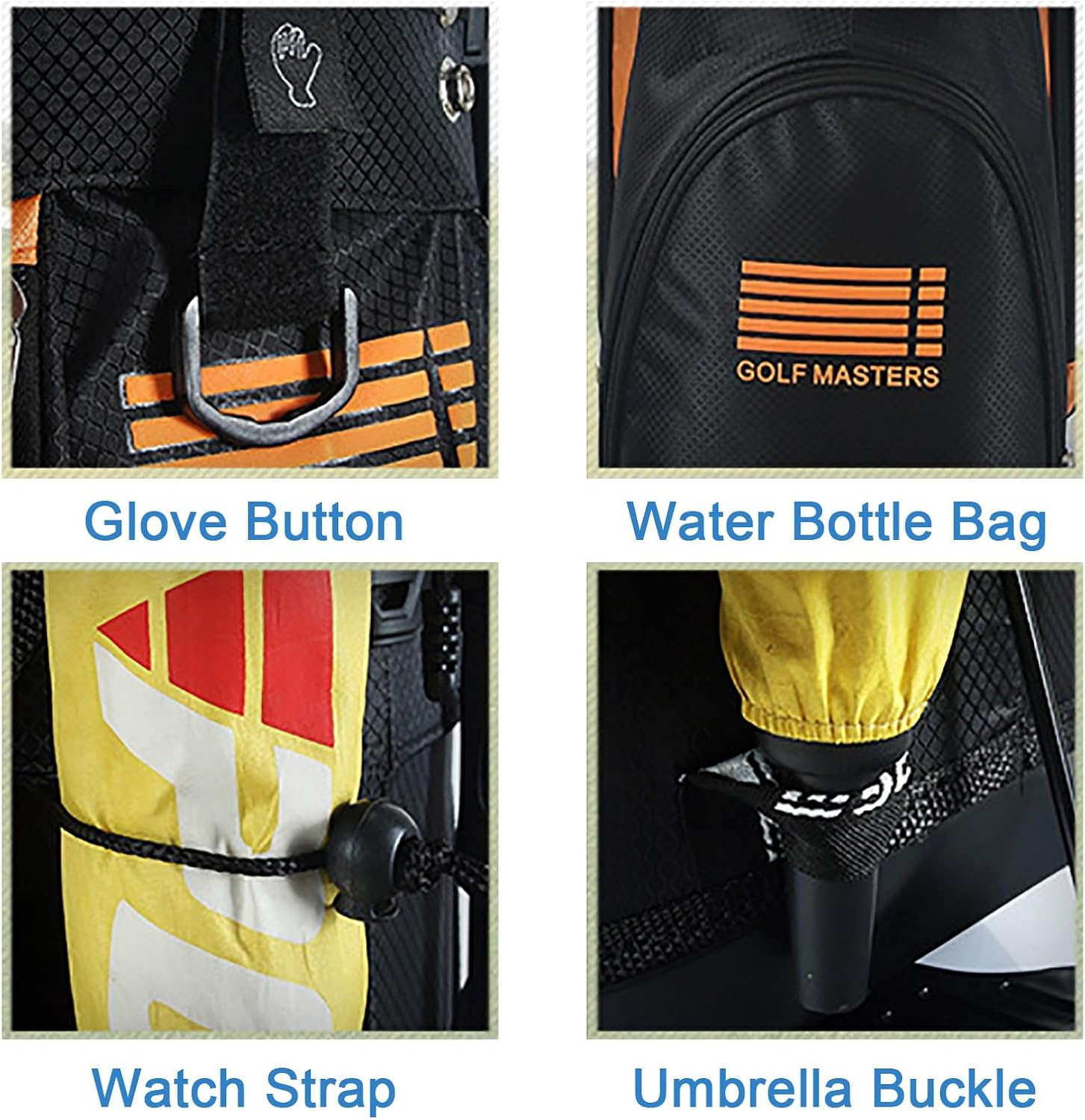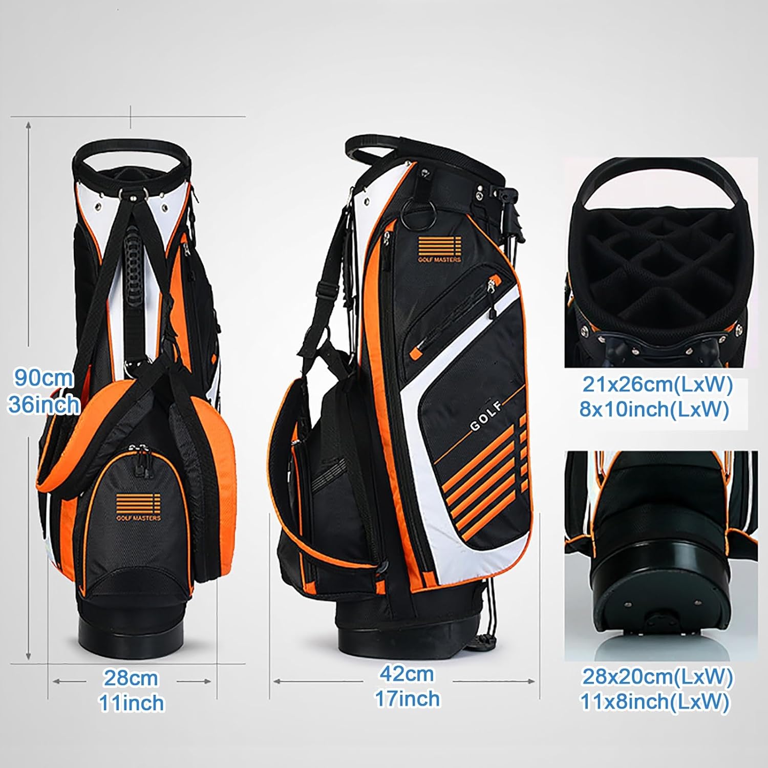 This lightweight bag is equipped with 5 zipper pockets ensuring you enough space to accommodate your accessories or divot tools.Material: Nylon Cloth, Fiber, Aluminum, Rubber, PP plasticColor: Green, Orange, WhiteNumber of Dividers: 14 WayUnit weight: 5 lbsBag length: 36inchSize of head frame: 8x10inchBase size: 8x11inchPackage Includes:1 x Golf Stand Bag1 x Waterproof Cap