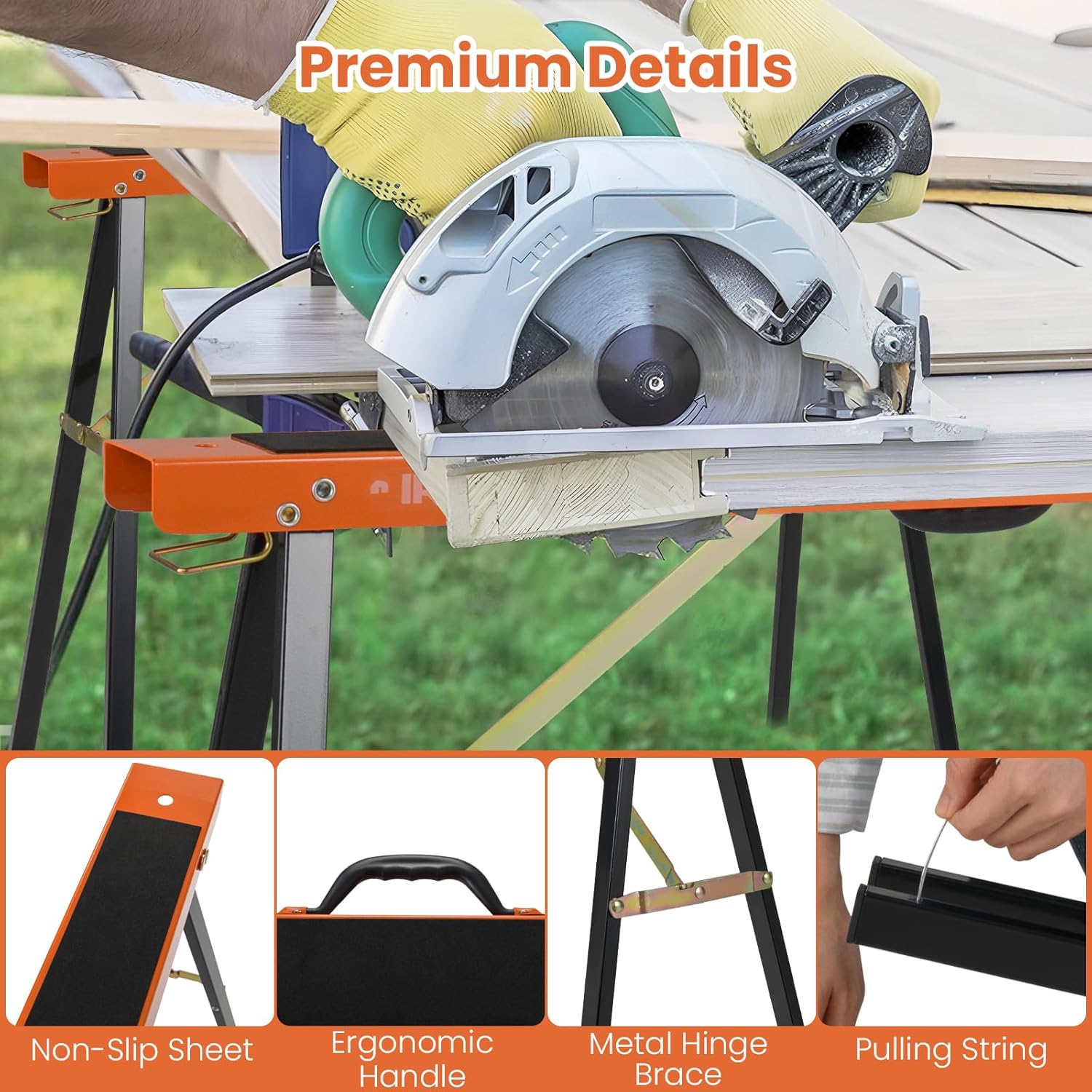 Description:Experience ultimate convenience with this 2-pack portable sawhorses.Constructed from robust galvanized metal, the 2 sawhorses with triangular structure can support up to 830 lbs together, offering strong support for heavy-duty work. Each sawhorse features an anti-slip work surface to keep materials secure and scratch-free. Moreover, the pre-drilled holes allow you to use screws to firmly secure workpieces in place. The compact folding size and light weight make them effortless to store and carry. With no assembly required, these sawhorses with premium details are immediately ready to tackle any job.Features:Galvanized metal structure for long-lasting stability2 sawhorses can load up to 830 lbs togetherEach weighs 9 lbs, which is simple to carry with handleCompact folding size for space-saving storageNon-slip surface protects the workpiecesDesigned with pre-drilled holes for firm placementNo need to assemble, saving time and effortSpecifications:Color: Black + OrangeMaterial: Galvanized MetalOverall Dimension: 39.5" x 15" x 31" / 100 x 38 x 78 cm (L x W x H)Folding Dimension: 39.5" x 1.5" x 3.5" / 100 x 4 x 8.5 cm (L x W x H)Weight Capacity of 2 Sawhorses: 830 lbs / 375 kgNet Weight: 18 lbs/8 kgPackage Includes:2 x Portable Sawhorses1 x Instruction