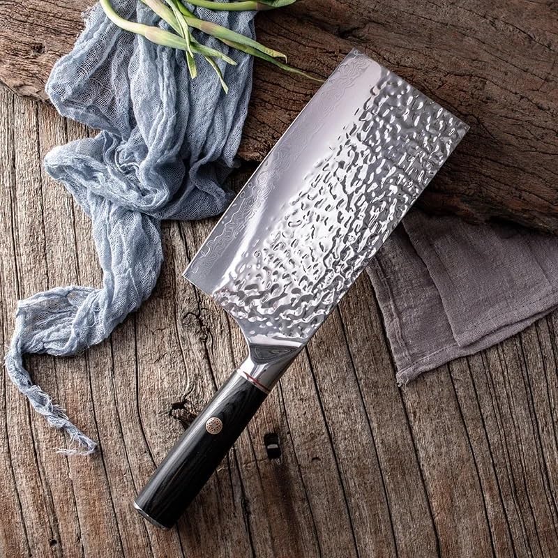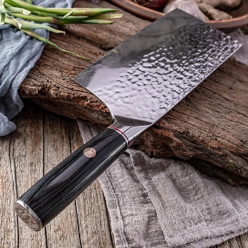 Feature:Eco-FriendlyMaterial:Damascus Steel + 5Cr15Full length:320mmBlade length:187mmBlade width:91mmBlade thickness:2.5mmWeight:405gHandle Material:Solid WoodItem Include:1 knife NOTE:Please allow slight measuring deviation due to manual measurement.