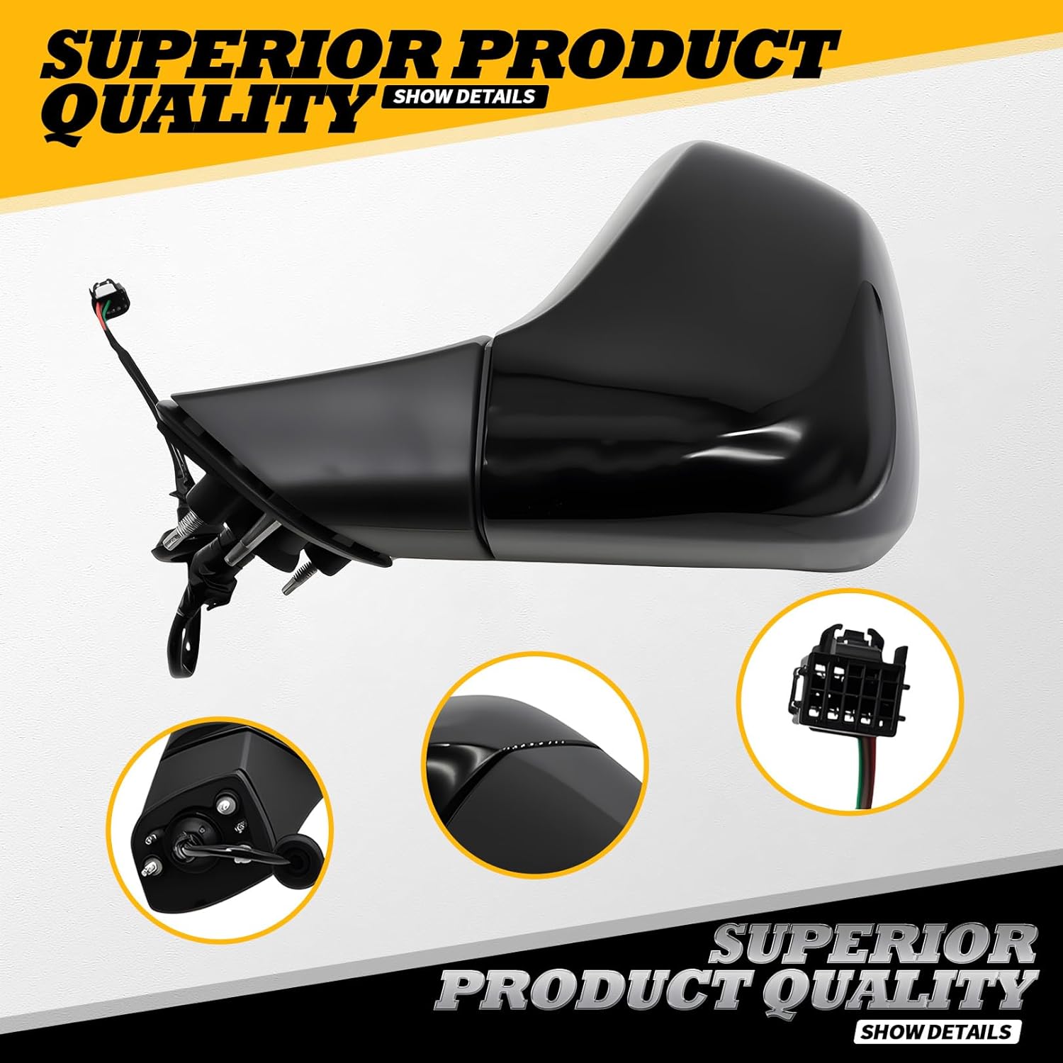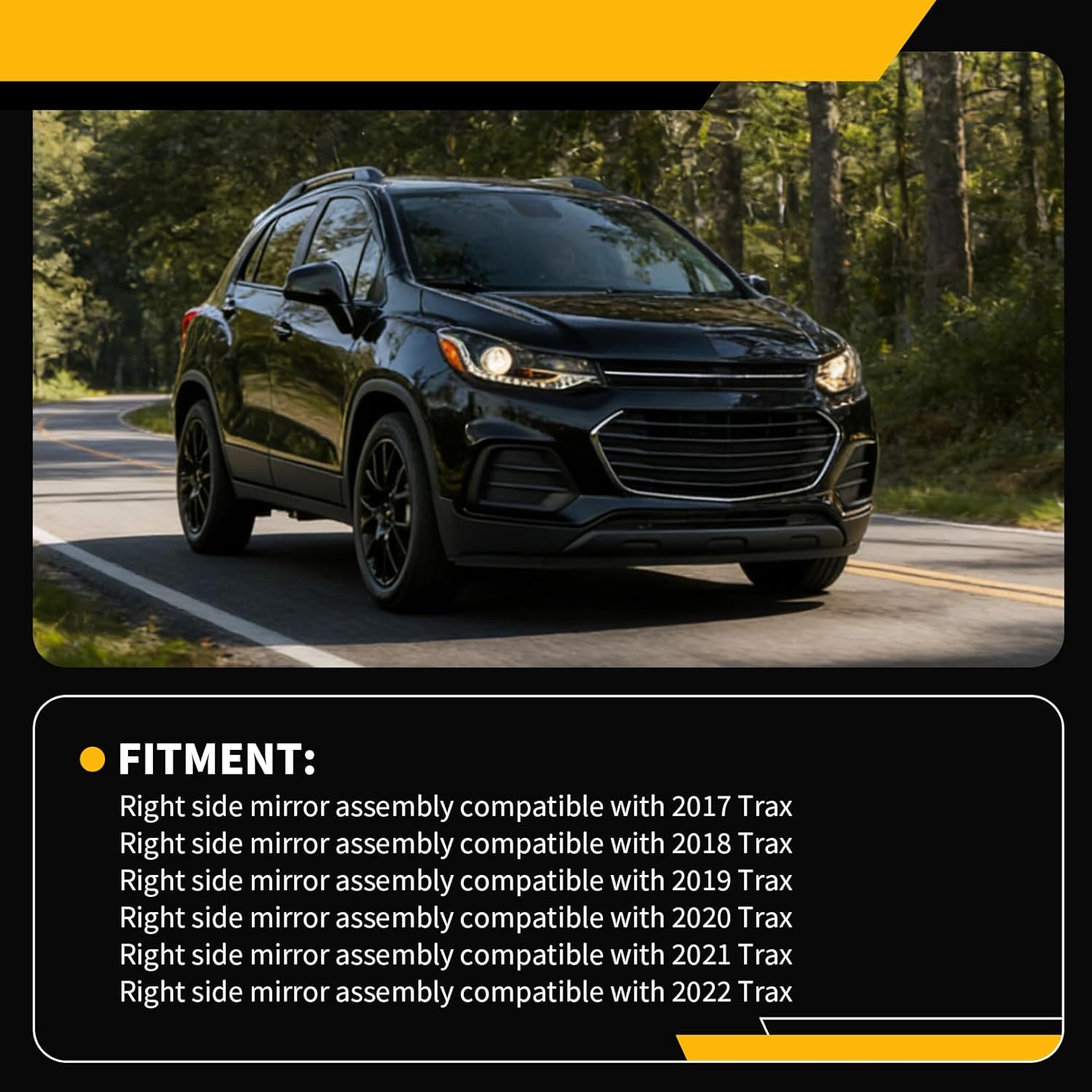 Fitment: Right side mirror assembly compatible with 2017 Trax Right side mirror assembly compatible with 2018 Trax Right side mirror assembly compatible with 2019 Trax Right side mirror assembly compatible with 2020 Trax Right side mirror assembly compatible with 2021 Trax Right side mirror assembly compatible with 2022 Trax Lens Curvature Description: Flat Special Features: Foldable, power glass Simple Installation: Exact fit and direct replacementLocation on Vehicle: Front, rightColor: Gloss black Package: 1 x Right side mirror assembly, you will receive as shown in the pictures