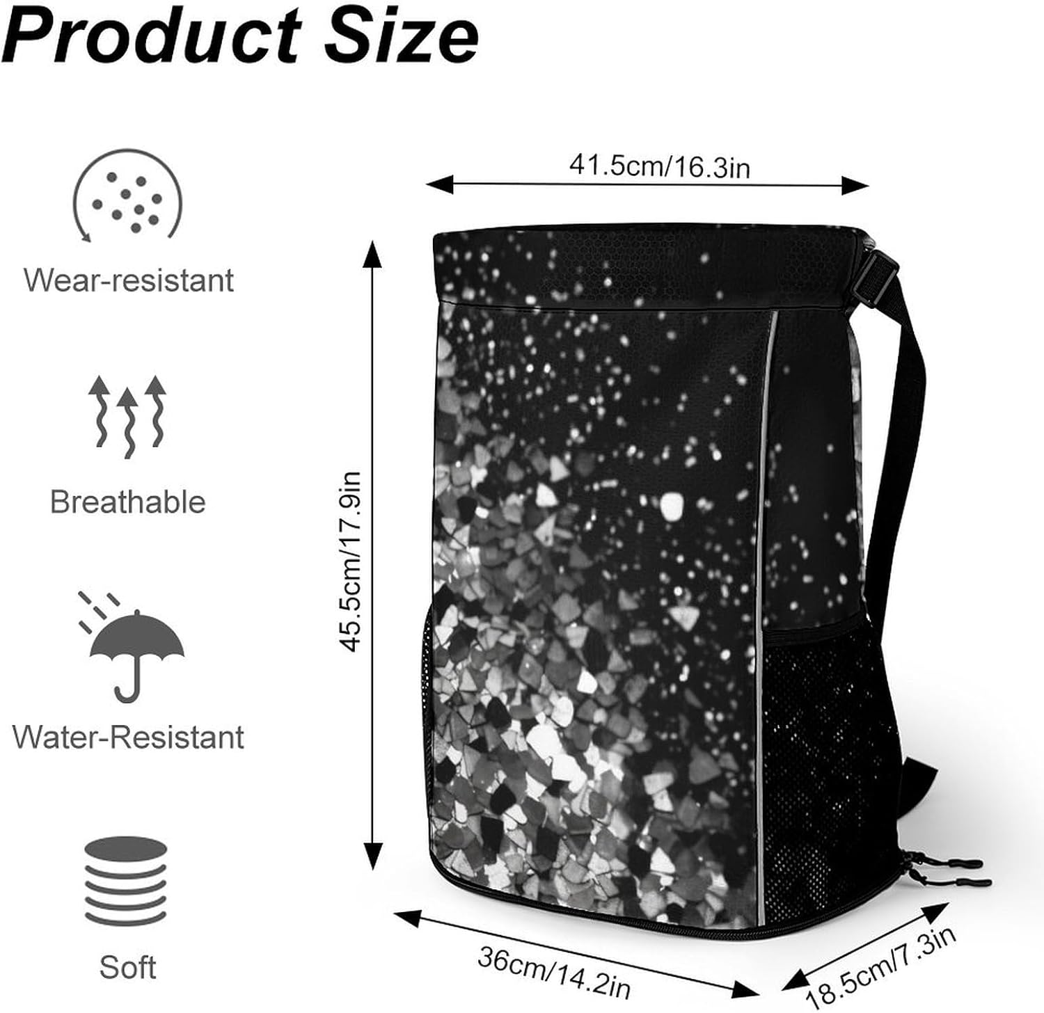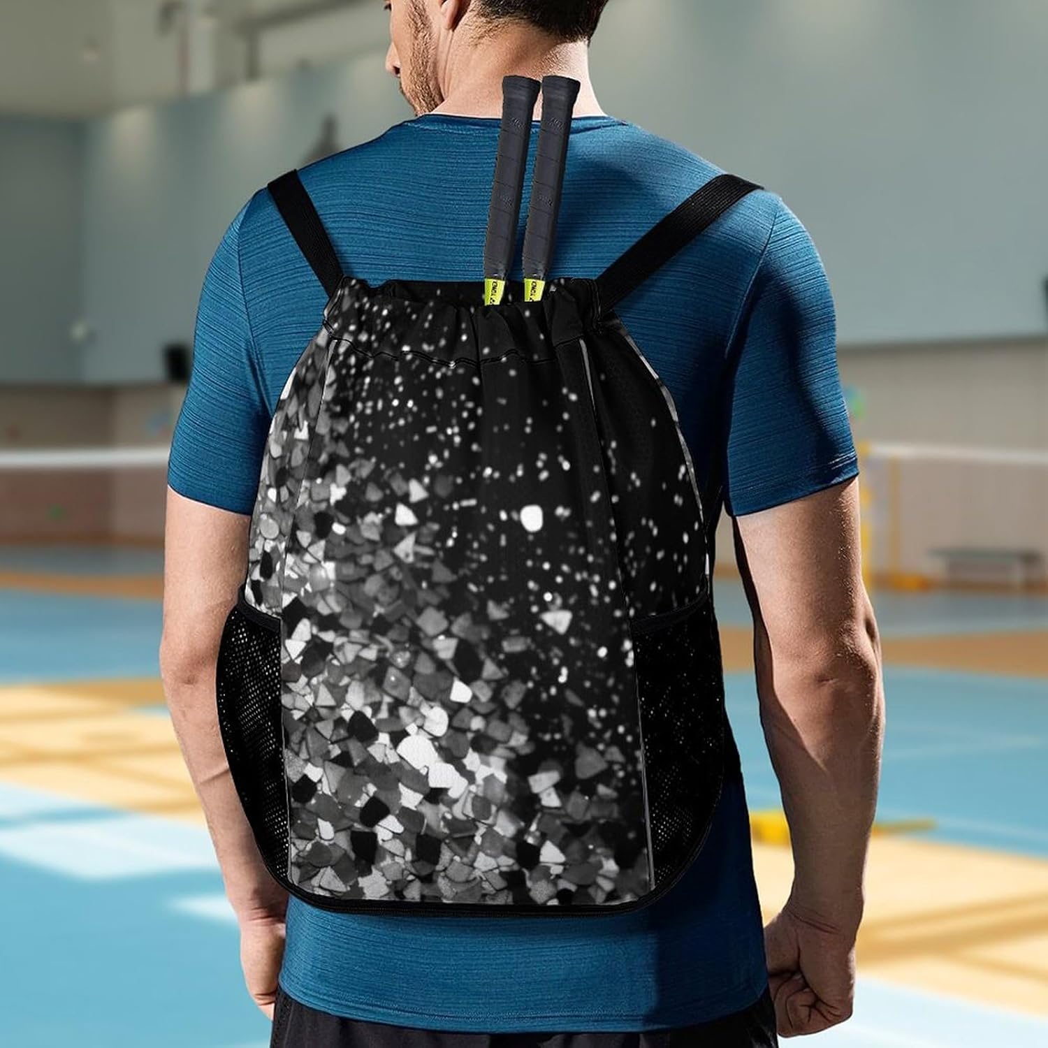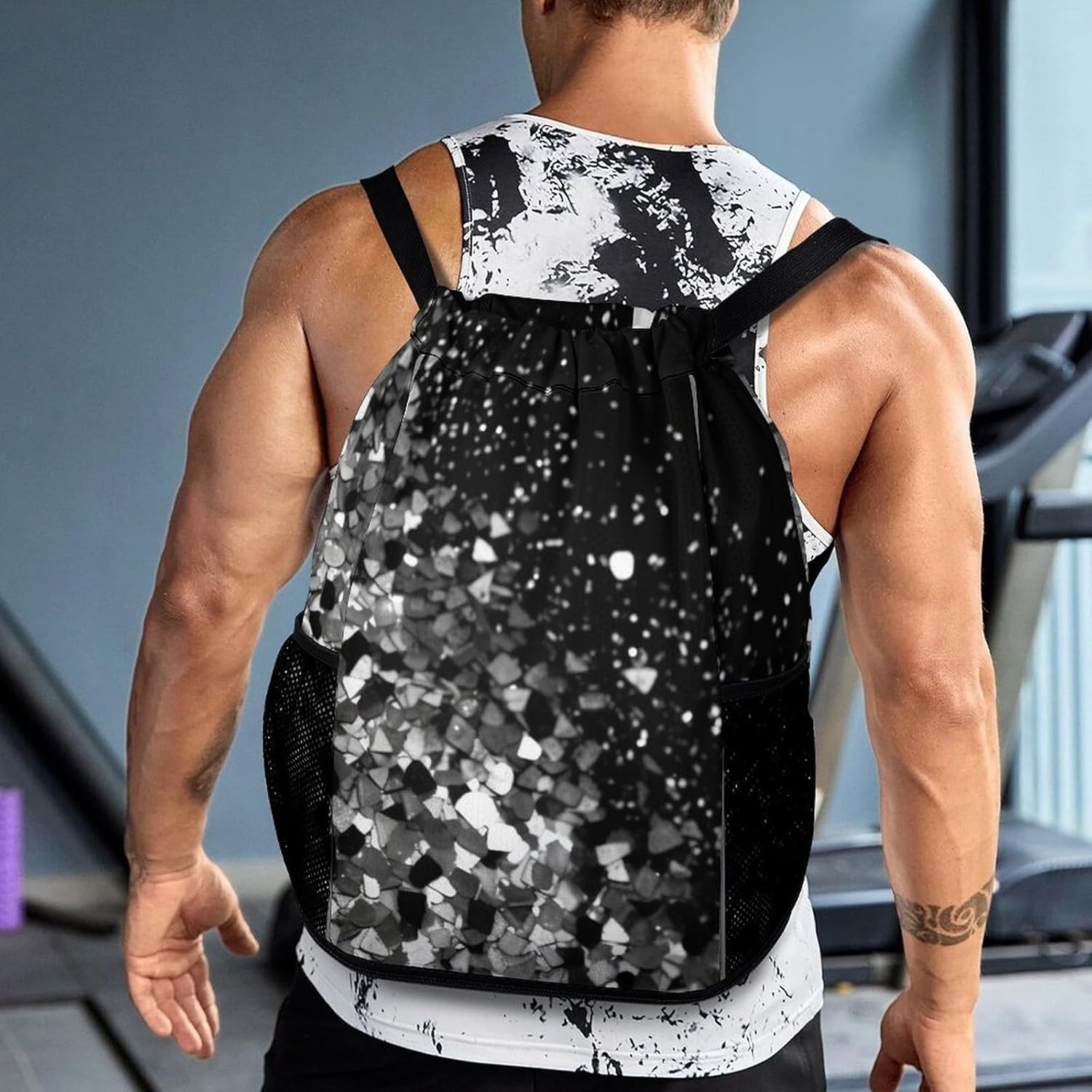 Our premium drawstring bag is the ideal companion for your active lifestyle. Made of premium honeycomb fabric, this pocket is not only durable but also has a comfortable textureA major feature of this Black White Glitter drawstring gym bag is the wet/dry separation design. Whether you are coming back from a sweaty workout or traveling in the rain, you can easily separate wet clothes or shoes from dry essentials such as electronics, documents or cosmetics. This innovative design keeps your items neatly organized and protectedWith a large zipper opening, it is very simple to access items. The zipper design conforms to the usage habits of most people and can be opened and closed smoothly and easily. You can easily and quickly get what you needThe sturdy structure of this sports bag is another feature. The edges of the shoulder straps are carefully processed, which makes it more resistant to heavy objects than ordinary bags. This ensures that it can accompany you in all sports and adventures without worrying about damageOur Sports Drawstring Backpack pocket also has a large capacity. It can hold a variety of items, from clothes and shoes to iPads, books, keys, ID cards, cosmetics and wallets. It is suitable for various occasions, such as traveling, going to work, fitness, etc. No matter where you go, this pocket can meet your storage needs