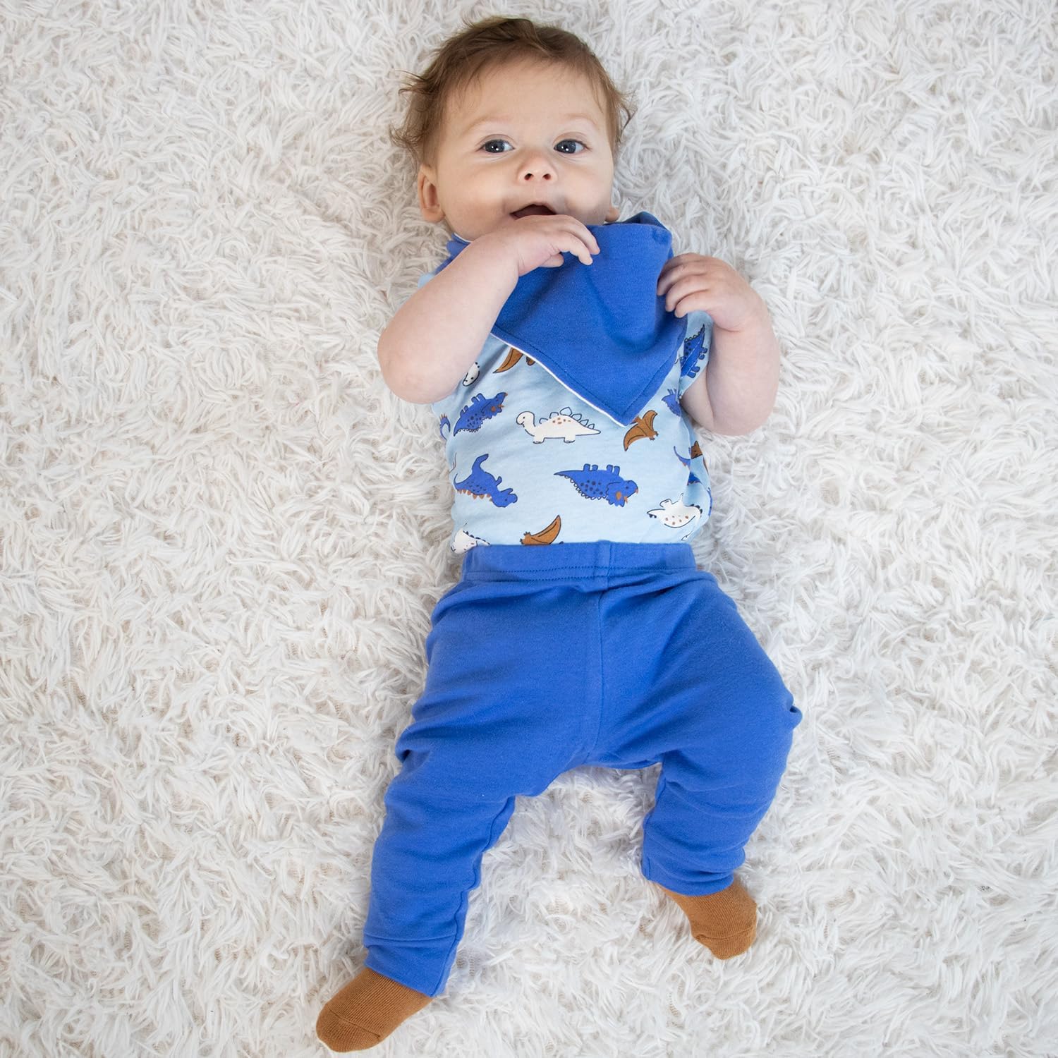 Meet the Blue Dino 15-Piece Layette Set by The Peanutshell—a playful collection in royal blue, light blue, and heather gray, brought to life with bold dino prints and classic stripes. Designed for little explorers, this baby essentials set is made to mix and match, offering endless outfit combinations that keep every day feeling fun. Inside you’ll find a soft long-sleeve footed sleeper, three short-sleeve bodysuits, four easy pull-on pants, three absorbent bandana bibs, and five cozy pairs of socks—everything you need for comfy dressing, from daytime play to snuggly sleep. With its durable cotton fabrics, and coordinating colors, this newborn baby boy clothes set is perfect for baby showers, gifting, and building a versatile wardrobe parents will reach for again and again. These fun baby boy bundles are great for showcasing your baby’s cool vibe in fall, winter, spring, and summer. Infant sizes available: 0-3 Months, 3-6 Months, 6-9 Months