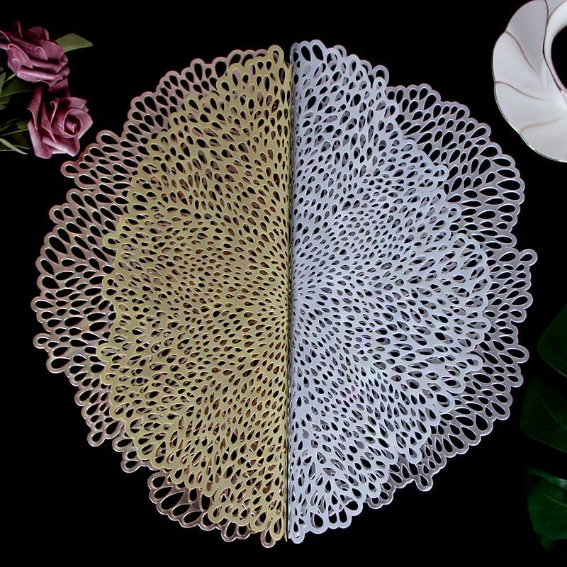 Hollow Out Gold Round Tablemats Fashionable and versatile gold round hollow placemats to create your sense of dining atmosphere. Anti-slip, heat insulation, dirt resistance, easy to wash, bringing you a very good use experience. They bring decorations for you to entertain your guests and leave a very good impression on them.