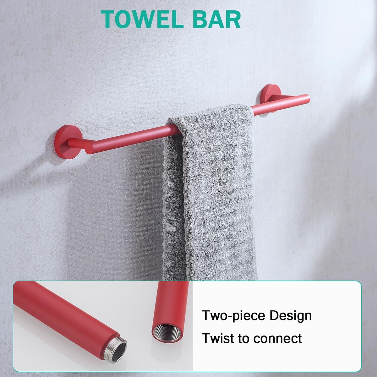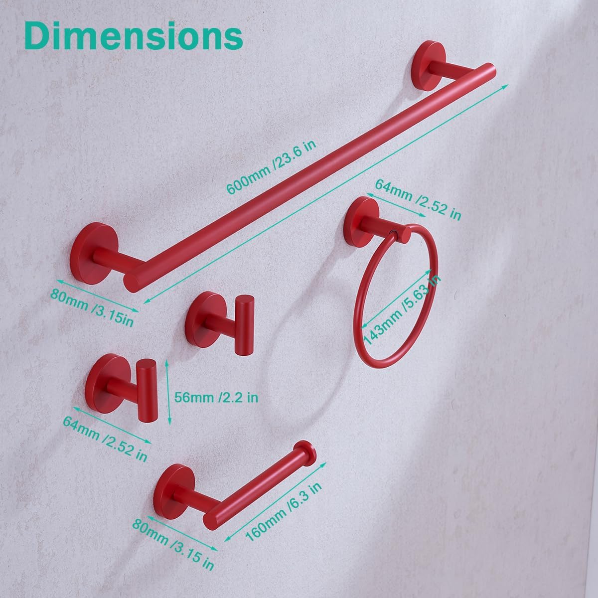 About the product: 1.Model: SE96006S-5RED 2.Material: SUS 304 stainless steel. 3.Screw material: SUS 304 stainless steel. 4.Surface treatment: red anti-rust. 5.The package includes: 1 x 24 inch towel bar,2 x towel hooks,1 x toilet paper holder,1x towel ring,Installation Hardware Pack & Installation Tool